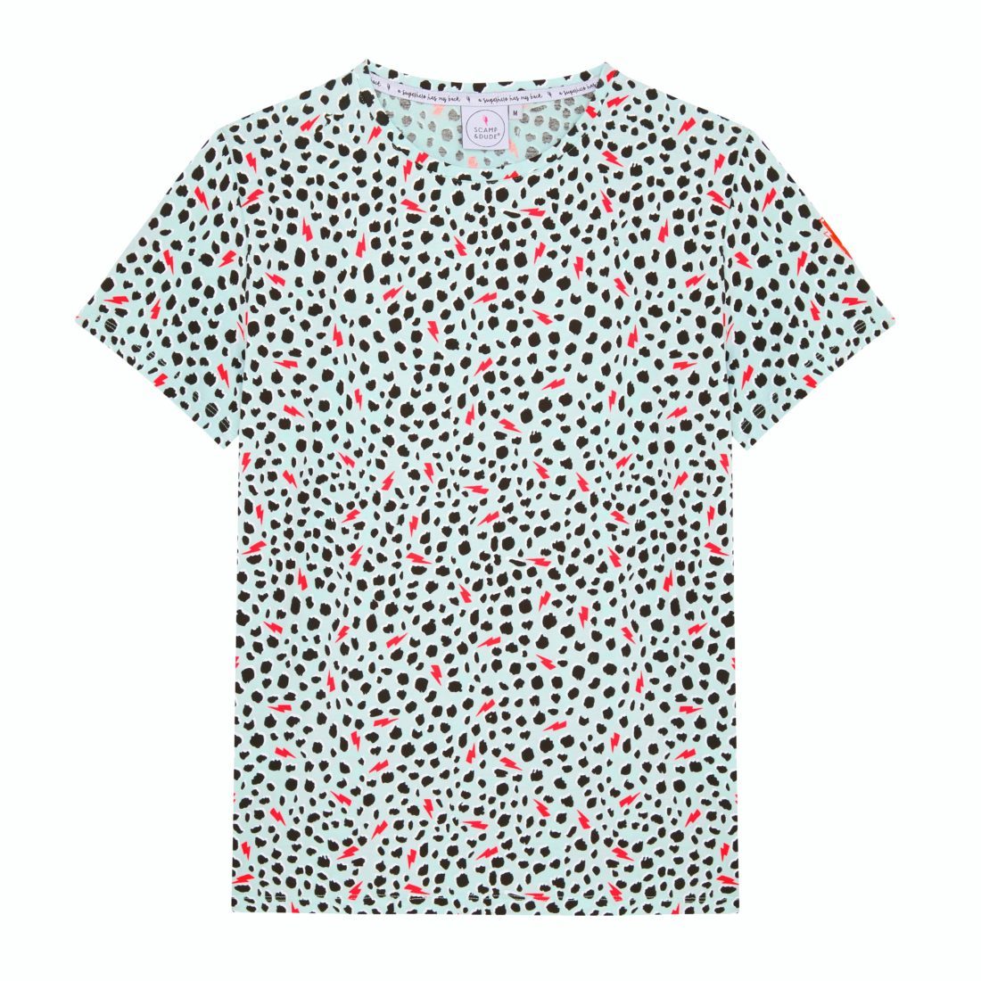 Pale mint green super soft T-Shirt with black cheetah print and neon pink lightning bolts
