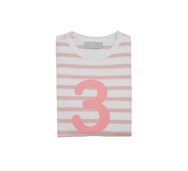 Dusty pink & white breton striped cotton T shirt, featuring a marshmallow number 3 screen print.