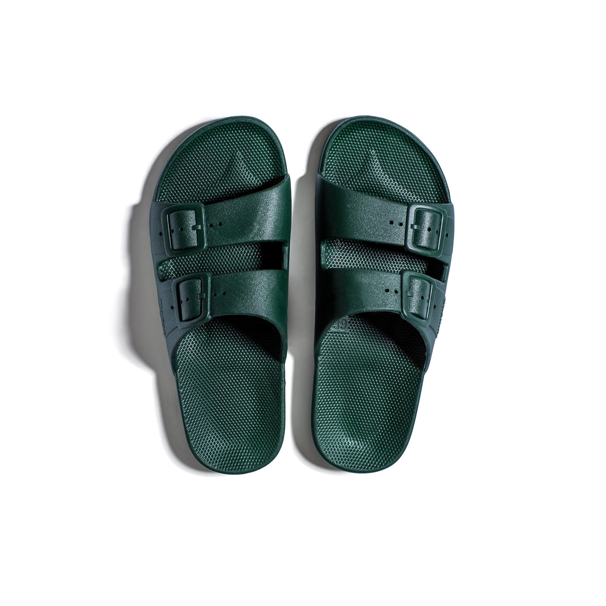 At Freedom Moses they are all about celebrating summer 365 days a year. From am to pm, Our Bottle Green slides vegan & sustainable slides are injected with air so you feel like you’re walking on a cloud. Whether chilling at the beach or just hanging out, we’re also available for your whole crew, from kids slides to women's slides and men’s slides, if you’re into prints, glitters, metallics or basic colors we’ve got you covered.
