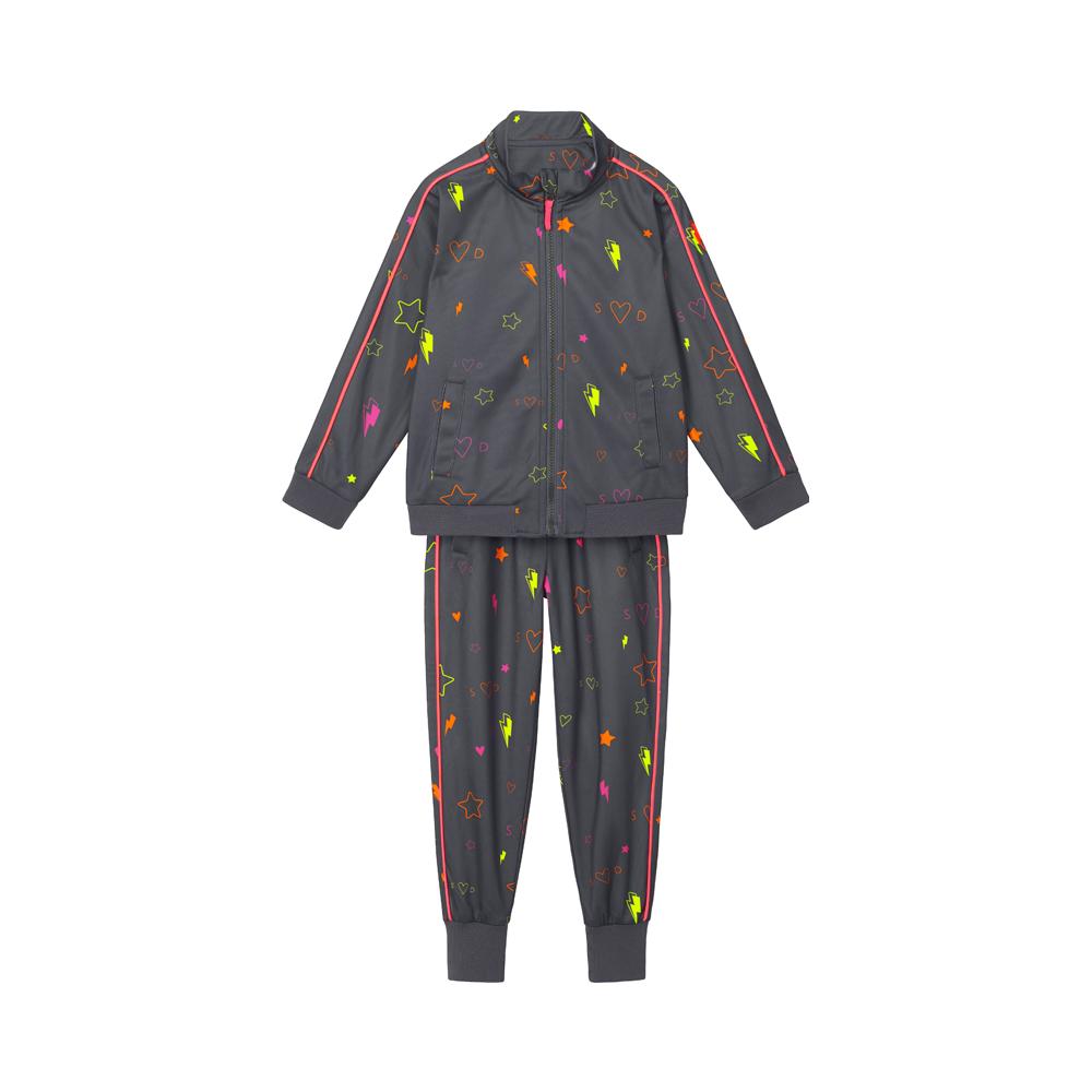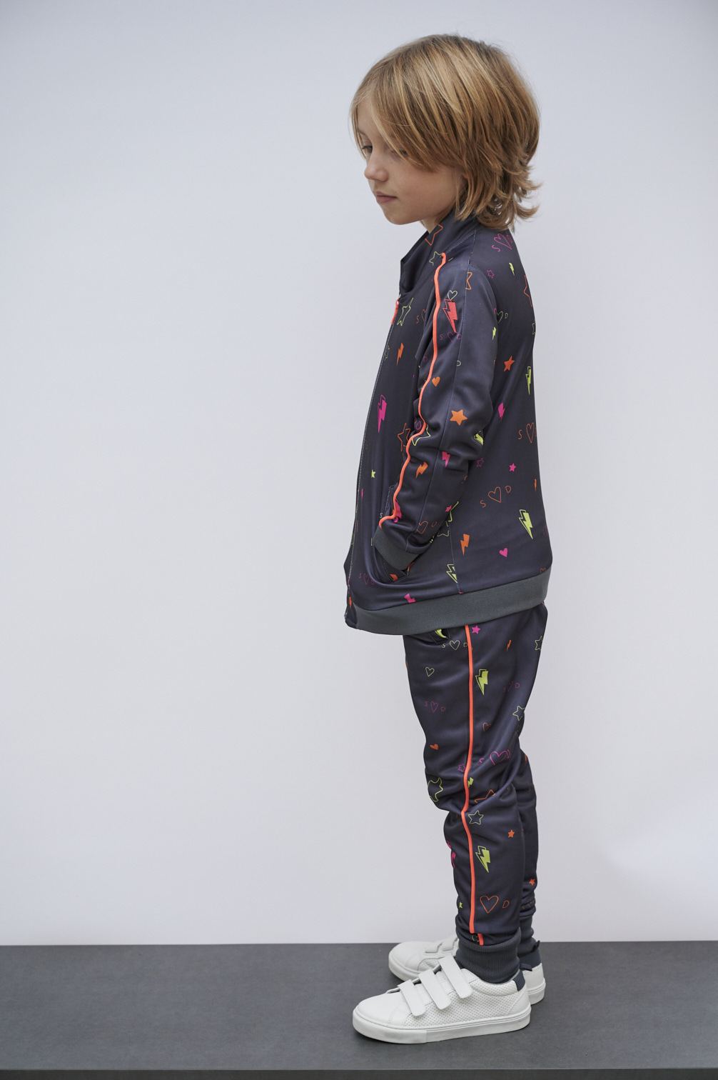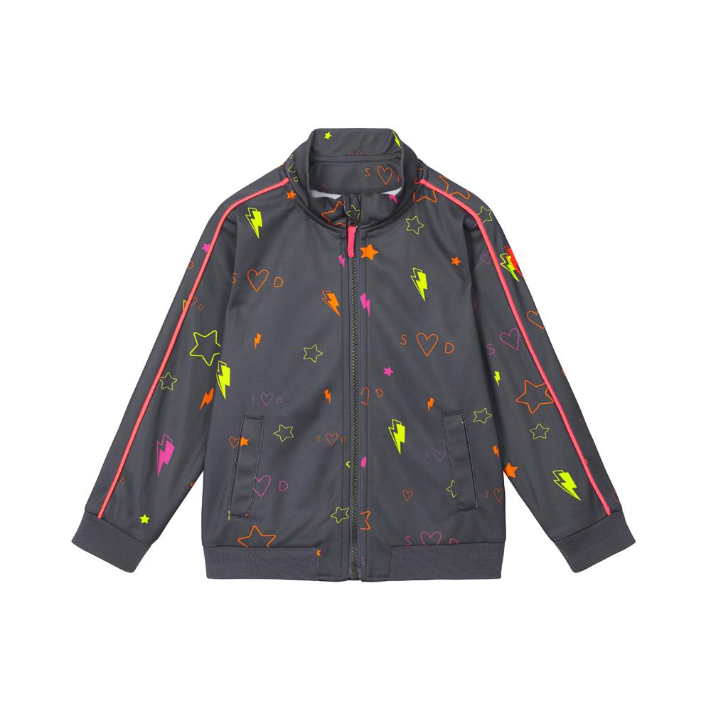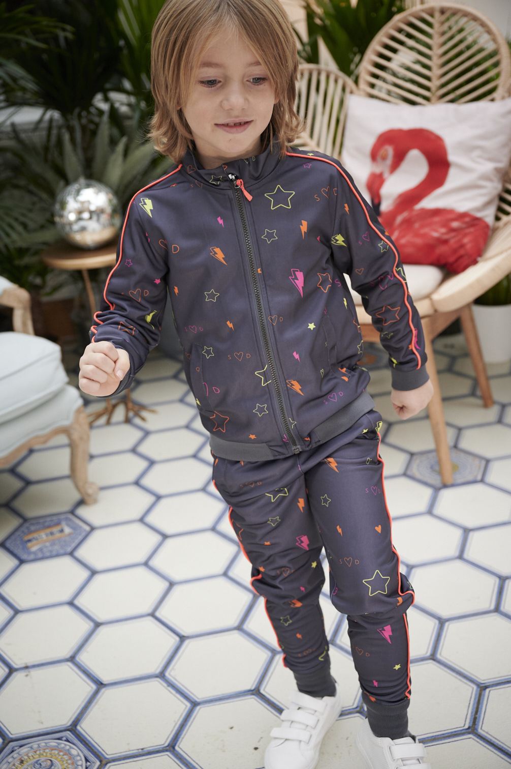 Dark grey with neon hearts and stars and Scamp & Dude's new special Love Army logo. Featuring the signature neon piping on the arms and a neon pull on the zip as well as concealed pockets with a zip for little hands to be tucked inside or stone collections and treats to be hidden. This jacket also has soft ribbed detailing at the cuffs, hem and funnel neck for extra comfort and is complete with our protective Superpower Button embroidered on the sleeve.