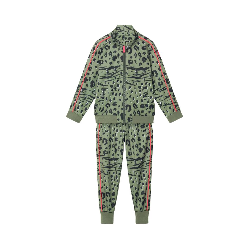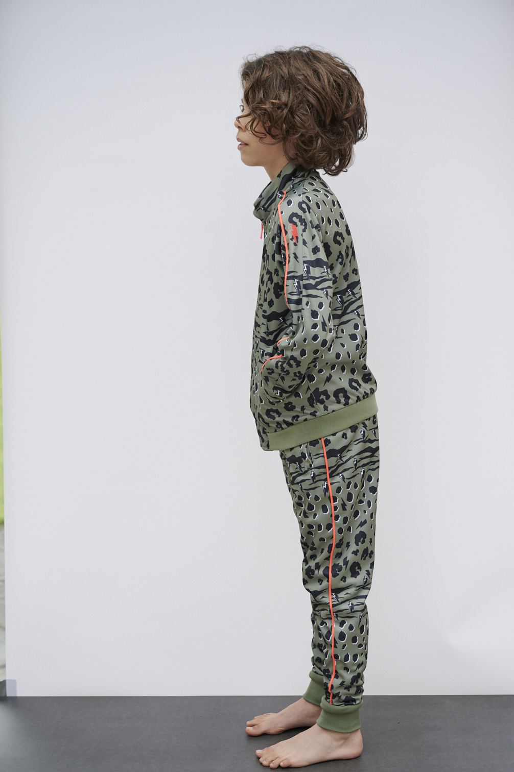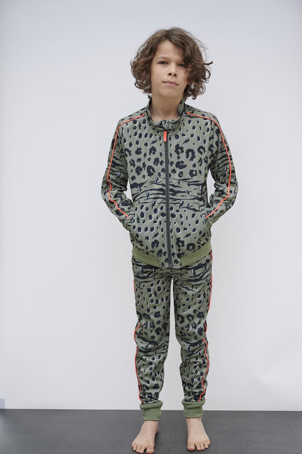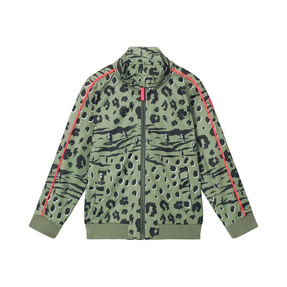 Khaki, mixed animal print, retro tracksuit top with Scamp & Dude's signature neon piping and neon pull on the zip. With super soft ribbed detailing at the cuffs, hem and funnel neck, as well as concealed pockets with a zip for little hands to be tucked inside or stone collections and treats to be hidden. Complete with our Superpower Button embroidered on the sleeve.