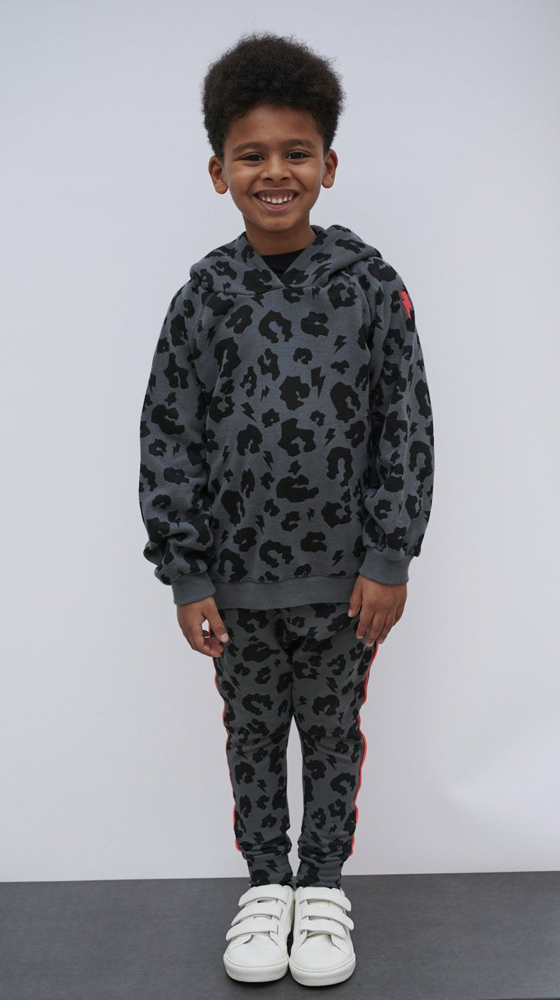 Charcoal grey, super soft hooded sweatshirt with our signature black leopard and lightning bolt print.
