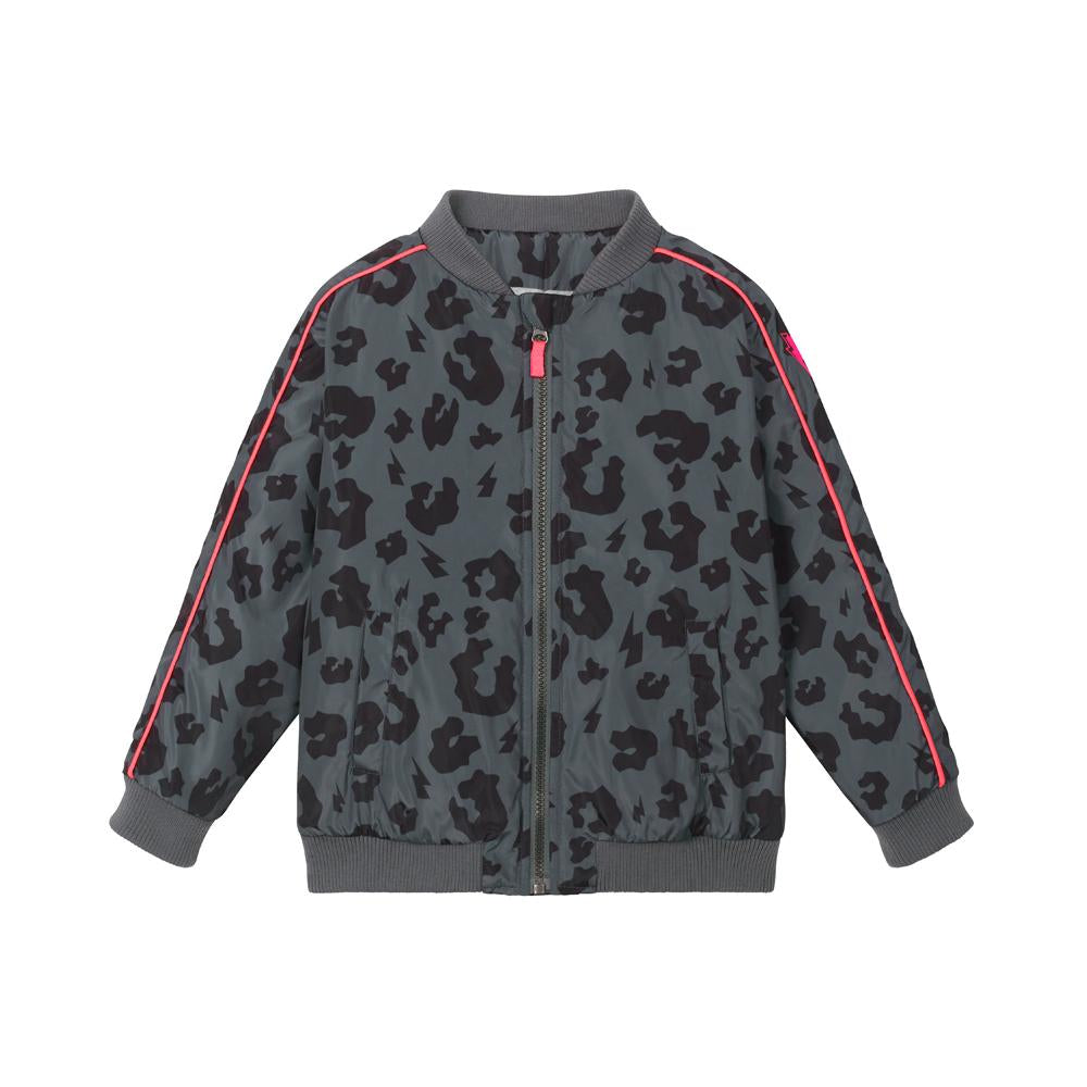 A super cool, unisex dark grey and black leopard and lightning bolt print, classic bomber jacket. Featuring our signature neon piping and a neon pull on the zip. The jacket is water resistant and padded for extra warmth, with a 100% cotton lining and soft ribbed detailing at the neckline, cuffs and hem for comfort.