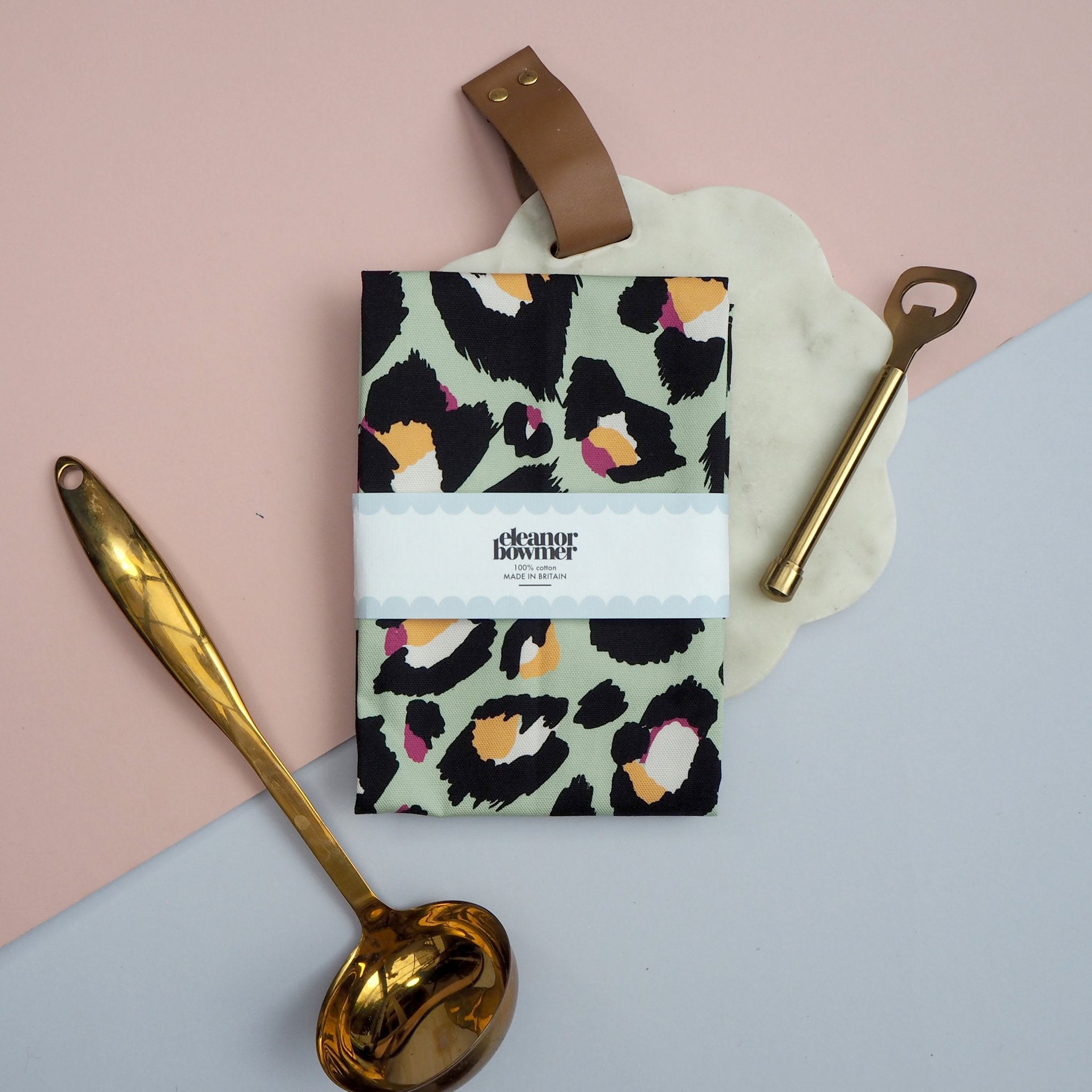 Pastel Green background with black, orange and fuchsia leopard print accents.
