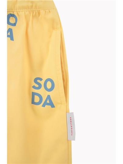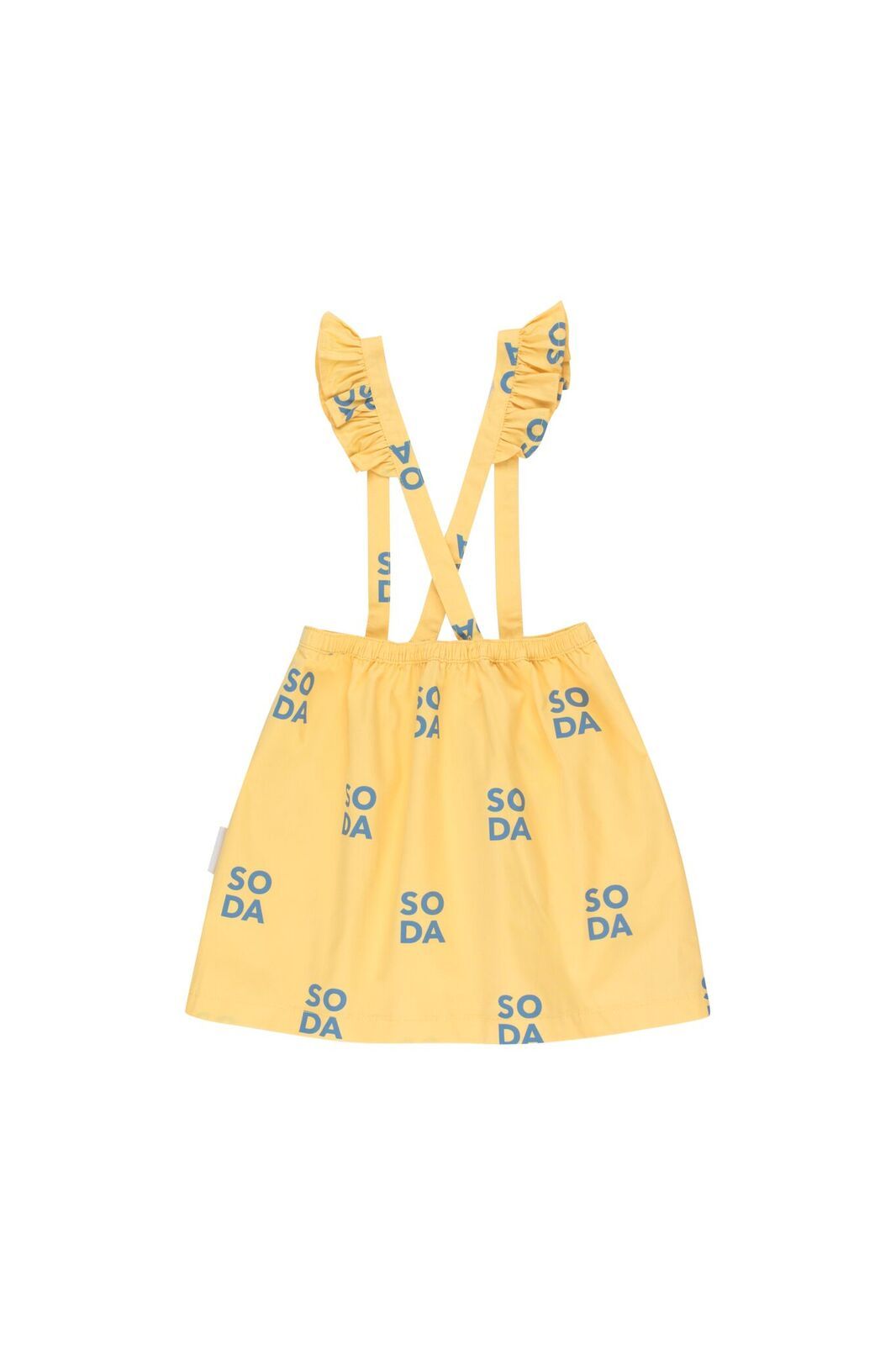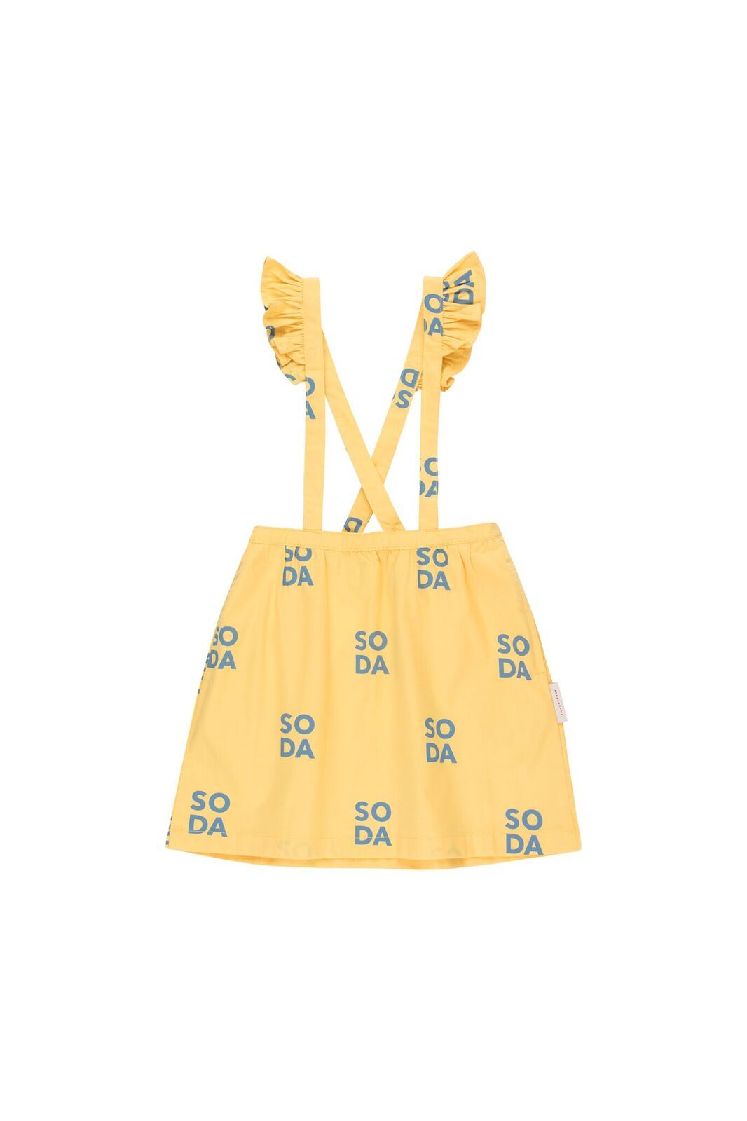 Tiny Cottons skirt with frill braces in a beautiful canary yellow colour woven base and a sea grey 'SODA' allover print