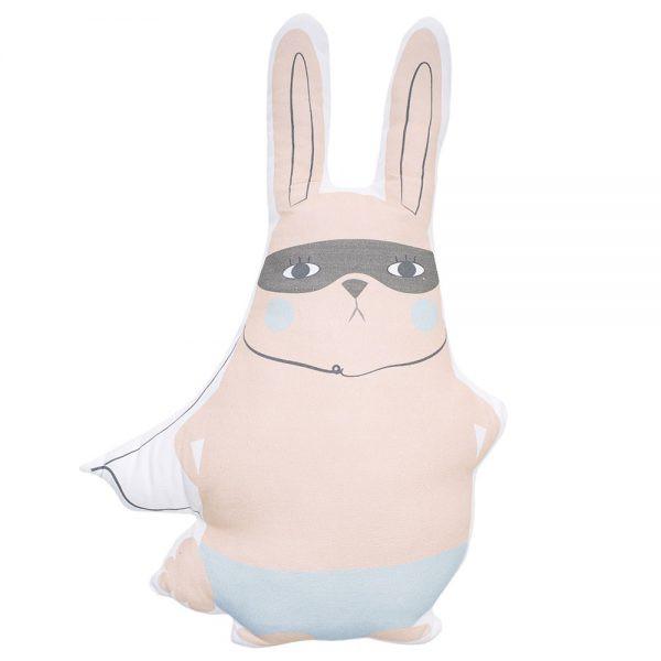 Special Superhero comforter to watch over kids and keep them safe while they sleep. Bunny shaped cushion, cotton twill cover, polyester inner.